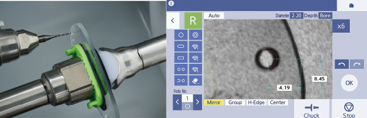 支持各類鏡架和多種孔型。鉆孔角度可以自動或手動設(shè)置,以實現(xiàn)高精度。鉆孔編輯界面提供高達 6 倍的放大倍數(shù),便于進行精確的數(shù)據(jù)調(diào)整。